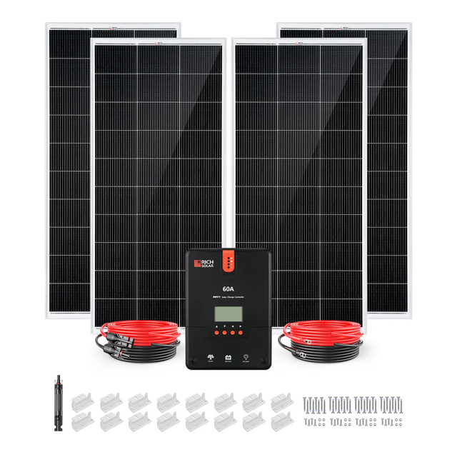 Our largest 12V kit contains 4 high-efficiency 200W Monocrystalline panels with 18 busbars and our 60A MPPT controller. This kit can be paired with 4 of our 100AH 12V Lithium batteries (Not Included) and is capable of powering off-grid RV solar systems, small RVs, and tiny homes. For a quieter, more peaceful outdoor experience, go solar now and start powering your RV solar setup, boat, or trailer!