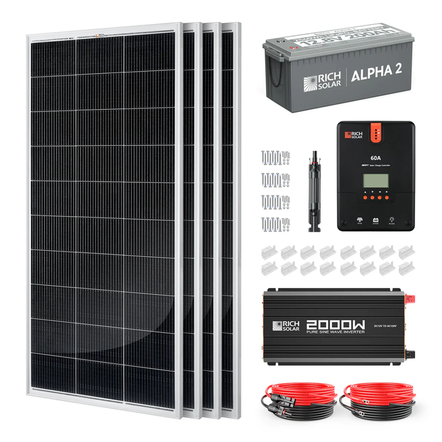Our 800W 12V Complete Solar Kit provides everything you need to start capturing, storing, and utilizing solar energy. The kit includes four high-efficiency 200W Monocrystalline panels, a 60A MPPT controller, a 2000W 12V inverter, and an Alpha 2 Lithium battery. Ideal for installation on your RV or tiny home, this kit equips you with a seamless solar adventure. Build your energy independence today!